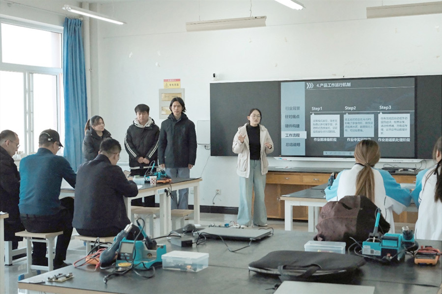 本次大赛严格参照自治区智能电子产品设计与开发赛项标准,深度结合学院农林水专业特色,聚焦物联网、传感器应用、电子装配等技术,要求参赛队伍开发制作以单片机为核心的农林智能控制系统。大赛设置技能展示与项目汇报两大环节,吸引了全院11支队伍40余名师生踊跃参与。其中,2024级无人机应用技术专业“西北雄鹰队”设计的无人船搭载智能水质监测板监测野外水体的创意、2025级智慧水利专业“有亿点菜队”设计的可视化智能漏水用水监测系统,展现出同学们在物联网、传感器技术、单片机技术方面的发展潜能。